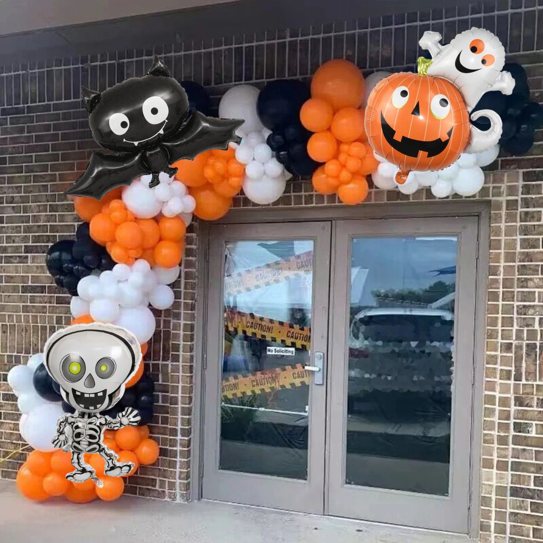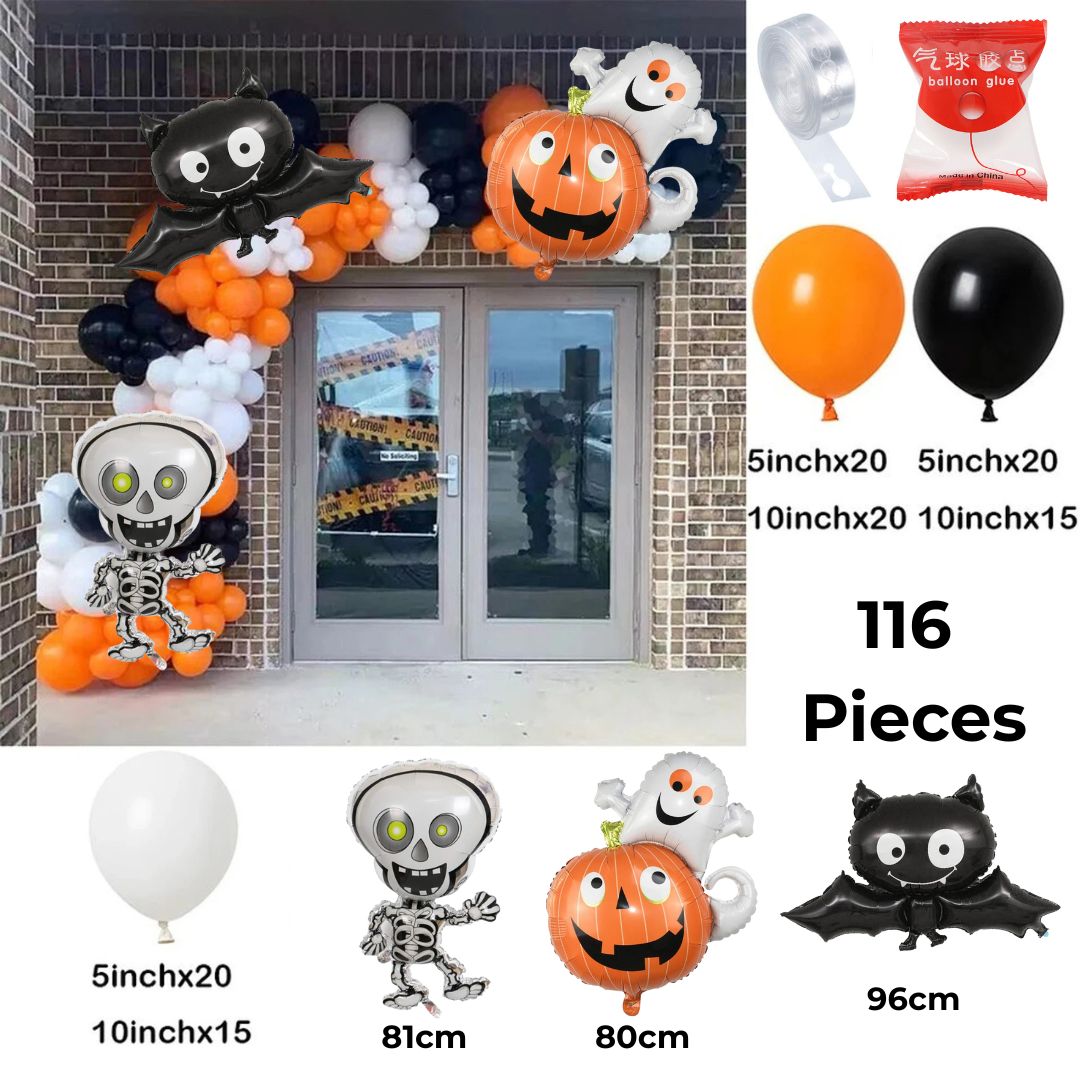 Transform your space into a spooky celebration with our Deluxe Halloween Balloon Garland Set – 116 pieces! Featuring black, orange, and white balloons, plus 3 foil balloons (skeleton, ghost with pumpkin, and bat), this kit includes everything you need to build the perfect Halloween backdrop.